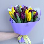 Контрастный, сочный и по-настоящему весенний букет, который поднимает настроение с первого взгляда. Глубокие фиолетовые тюльпаны красиво оттеняют солнечно-жёлтые бутоны, создавая эффектный дуэт цвета «аметист и солнце». Плотная зелень листьев добавляет свежести, а лиловая упаковка и нежная лента завершают образ аккуратно и современно.