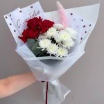 Состав: красные розы, белая хризантема, эвкалипт, декоративные элементы/сухоцветы, дизайнерская упаковка (возможны небольшие замены по сезонности при сохранении стиля и гаммы).